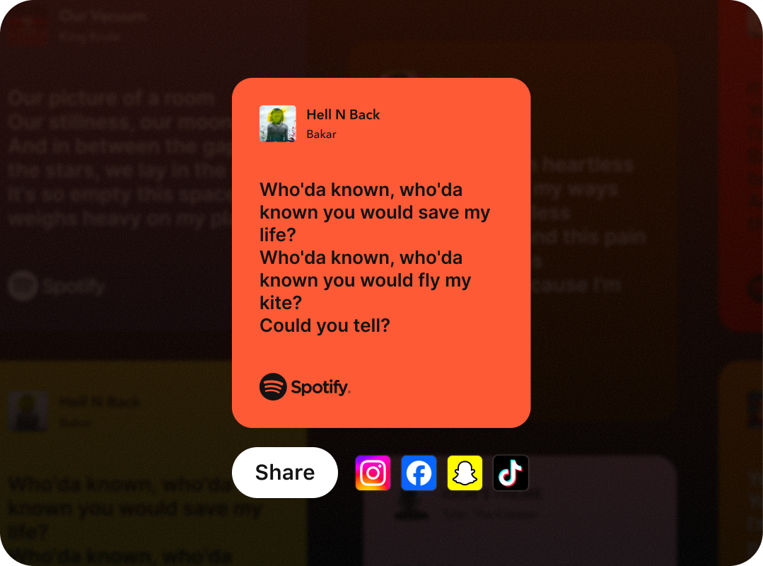 Get your lyrics live on Spotify and beyond with synced, shareable lyrics.
